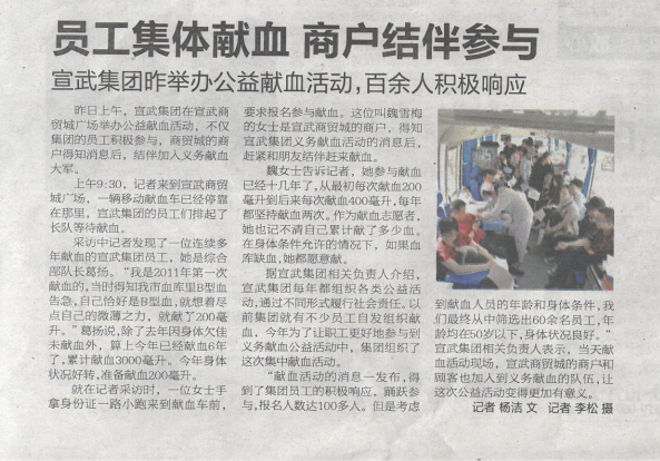 2017年4月22日,《都市晨報》對宣武集團(tuán)職工無償獻(xiàn)血活動進(jìn)行報道,彰顯了宣武社會正能量。